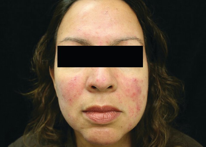 37 yo F evaluated for acne that developed as an adult. She also has episodes of skin flushing in response to eating spicy food. Facial findings shown here: