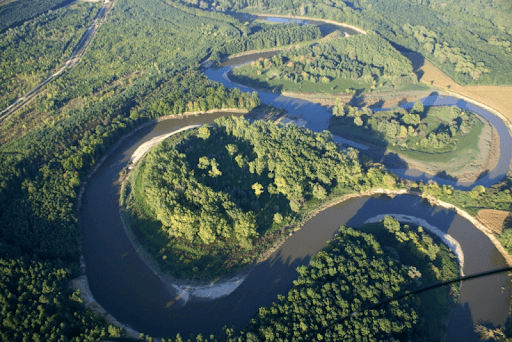 What is one example of an environmental event that can cause a meandering river like this to change its path?