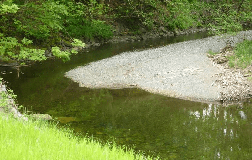 Water flows fastest in the outside of the bend. The reason there is a lot of sand and pebbles on the inside bend is because water does not move fast enough to move these sediments. The water is deeper on the outside of the bend because fast water has carried away all of the smaller sediments.