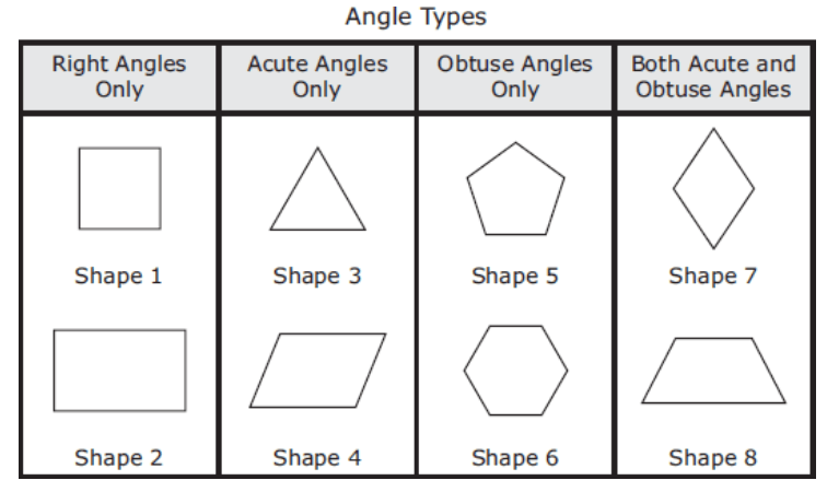 Rachel classified shapes based on the types of angles they had. The table shows her classifications.