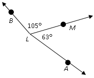 Name an acute, right, obtuse, and straight angle in the angle below.