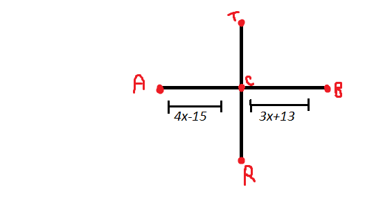 Line TR bisects AB at C. If line AC=4x-15 and CB=3x+13. Find x.