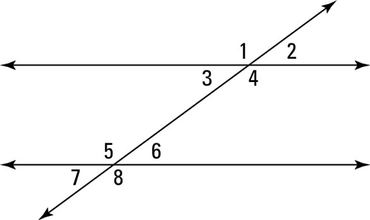 What kind of angles are 1 and 4, 2 and 3, 5 and 8, and 6 and 7, respectively?