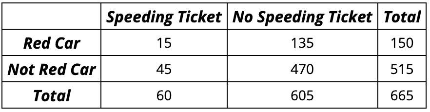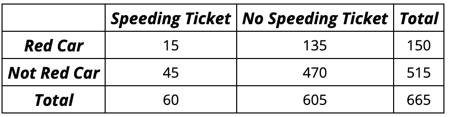 Given that someone does not have a red car, what is the probability that they DO NOT get a speeding ticket.