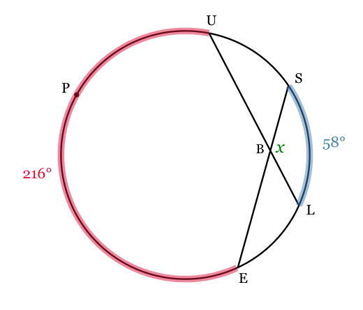 If the measurement of arc UPE=216o and the measurement of arc LS=58o, find m∠LBS.