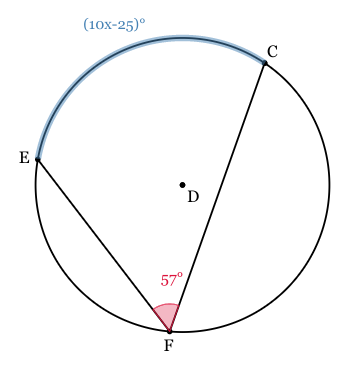 In circle D, m∠CFE=57o. Solve for x if the measurement of arc CE=(10x−25)o. If necessary, round your answer to the nearest tenth.