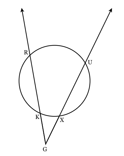 If the measurement of arc KX=32o and m∠G=36o, find the measurement of arc RU.