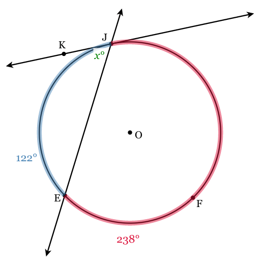 line JK is tangent to circle O at point J, and line JE is a secant line. If the measurement of arc JFE=238o, find m∠EJK.