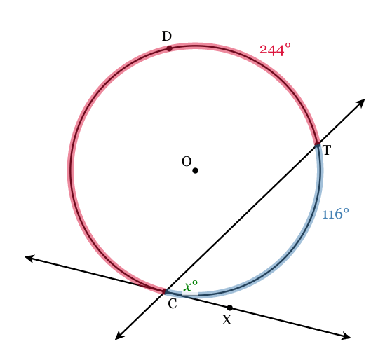 line CX is tangent to circle O at point C, and line CT is a secant line. If the measurement of arc CDT=244o, find m∠TCX.