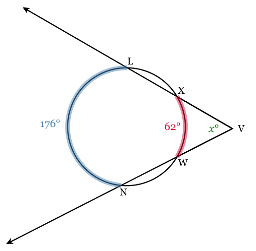 If the measurement of arc WX=62o and the measurement of arc NL=176o, find m∠V.