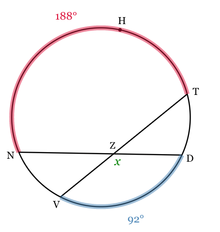 If the measurement of arc THN=188o and the measurement of arc VD=92o, find m∠VZD.