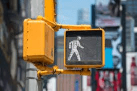 Press the button to turn on the light. Look to make sure it is safe. Cross the road.