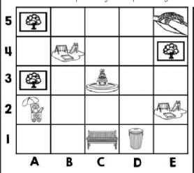 Start at E5. Turn clockwise/ counterclockwise, half-turn, and go straight 4 steps until you reach A5.