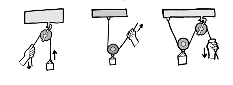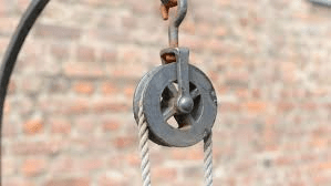 A pulley is a system that uses a rope and wheel. The wheel has a grooved track for the rope to run through