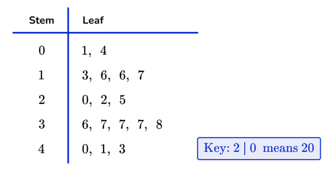 Find the median, mode, maximum, minimum and range of the stem and leaf plot.