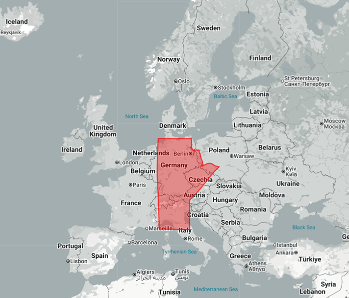 What is name of the geographic area outlined in red and overlaying the countries in Europe called?