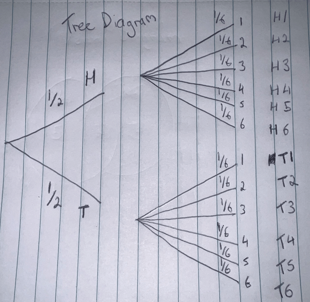 Complete a Tree Diagram for flipping a coin once and then rolling a 6 sided dice.