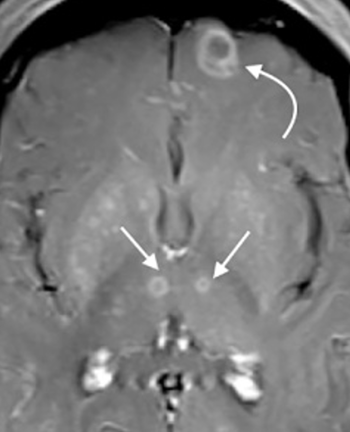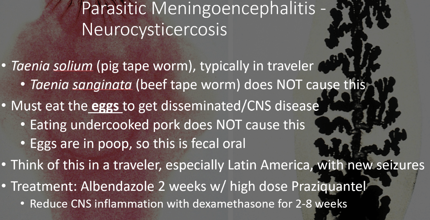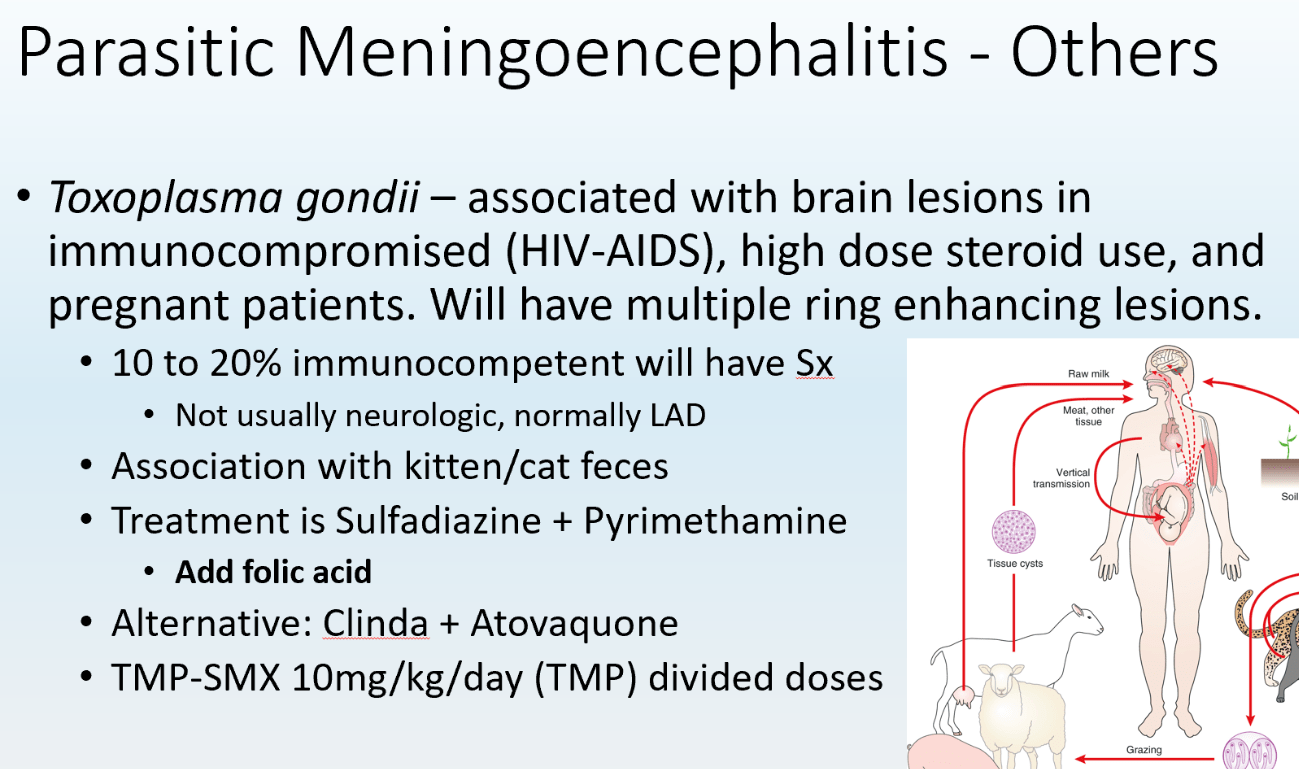 This is the treatment for a patient who is on long-term steroids with the following brain imaging. This patient is an excellent historian who tells you they recently decided to let their cat explore the outdoors where the cat quickly became skilled at catching (and eating) small prey.
