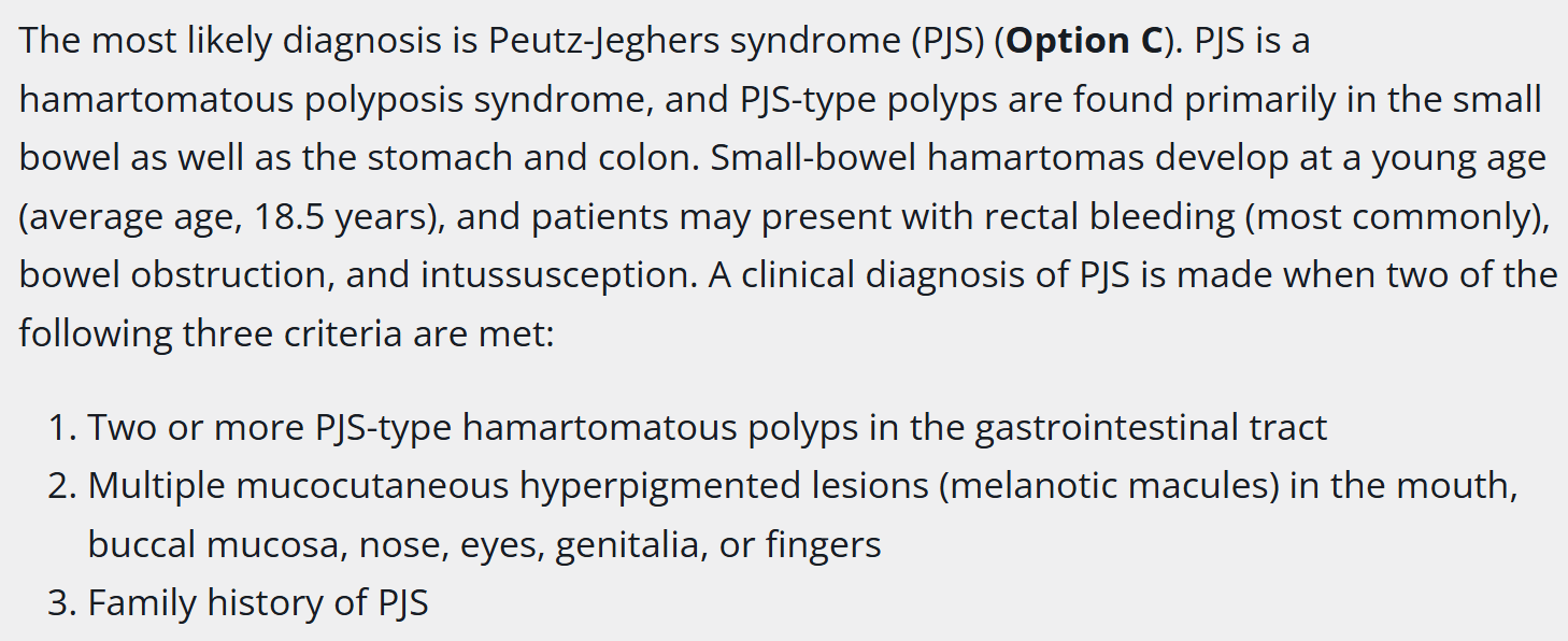 This is the likely diagnosis in a 21 yo male presents with new onset rectal bleeding. You note that he has melanotic macules on his face and fingers on physical exam. Additionally, he tells you that he thinks his mother had multiple colonic polyps.