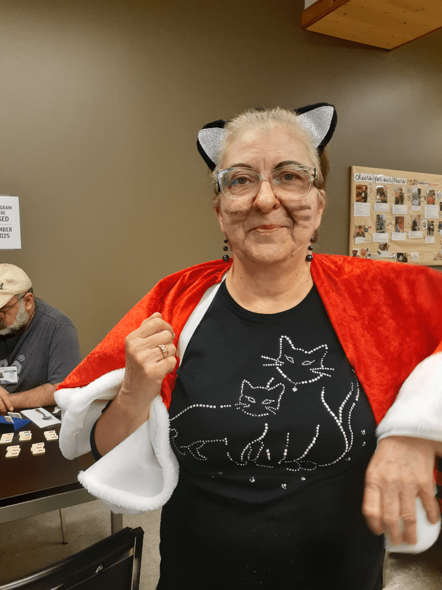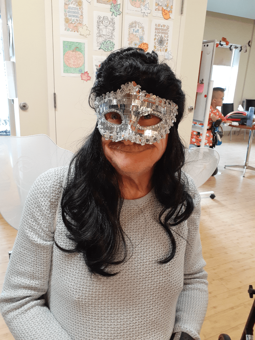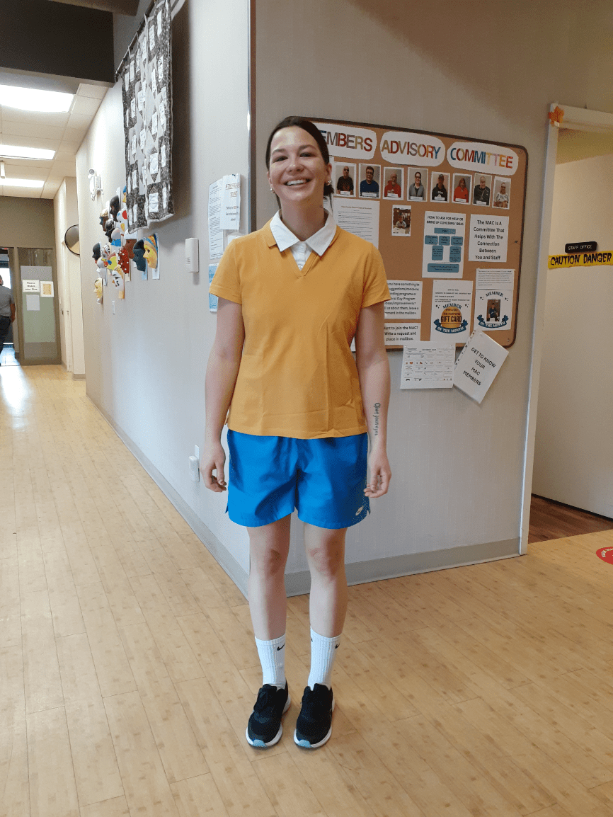 What does the back of Sharon's costume say?
