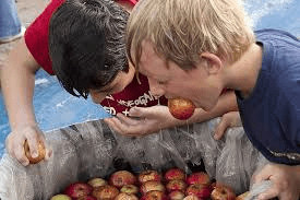 What activity involves bobbing your head in water to grab fruit without using your hands?