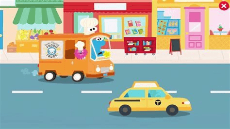 Cookie Monster and Gonger are driving the Foodie Truck outside in the street.