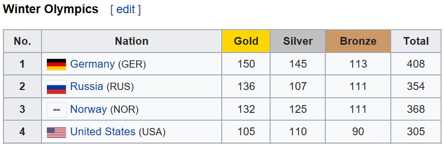 WINTER OLYPICS - WHAT NATION IS SECOND ALL TIME IN THE TOTAL MEDALS LADDER?