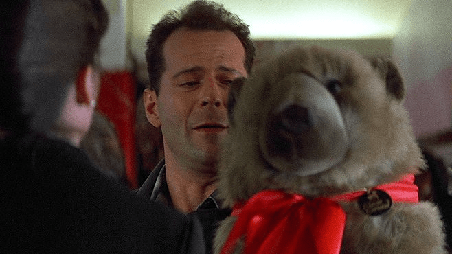 In Die Hard, which is a Christmas movie, what does John McClane carry through the airport?