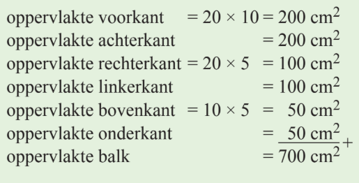 Als je de oppervlakte van een balk uit moet rekenen dan moet je de oppervlakte van 6 vlakken berekenen.