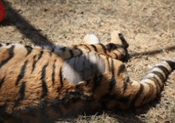A tigers skin is striped just like it's fur.