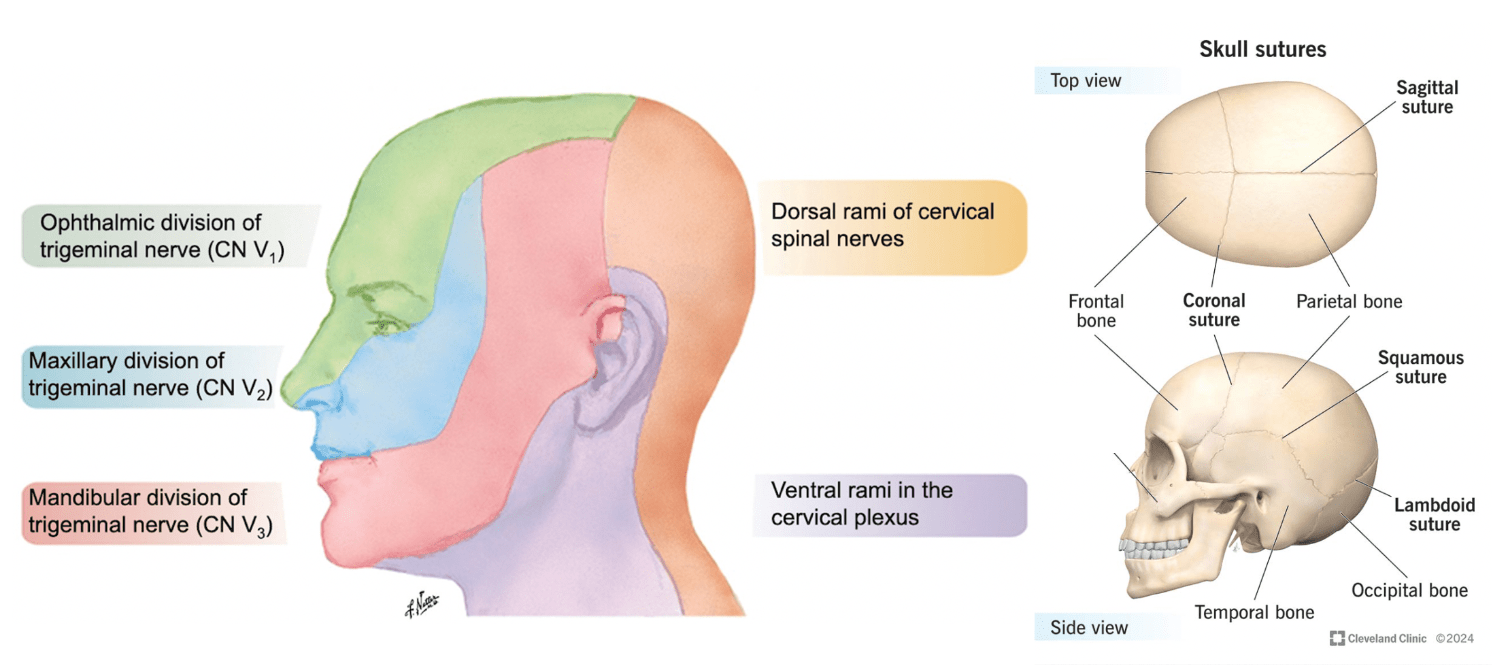 A woman’s lock of hair becomes caught in an industrial roller machine, producing a localized scalp degloving injury that tears through the epicranial aponeurosis in the skin overlying the former location of the anterior fontanelle. The resulting gaping wound bleeds heavily due to the dense vascular network of the scalp, and sensation is lost in the surrounding area. Which nerve division provides sensory innervation to this region of the scalp?