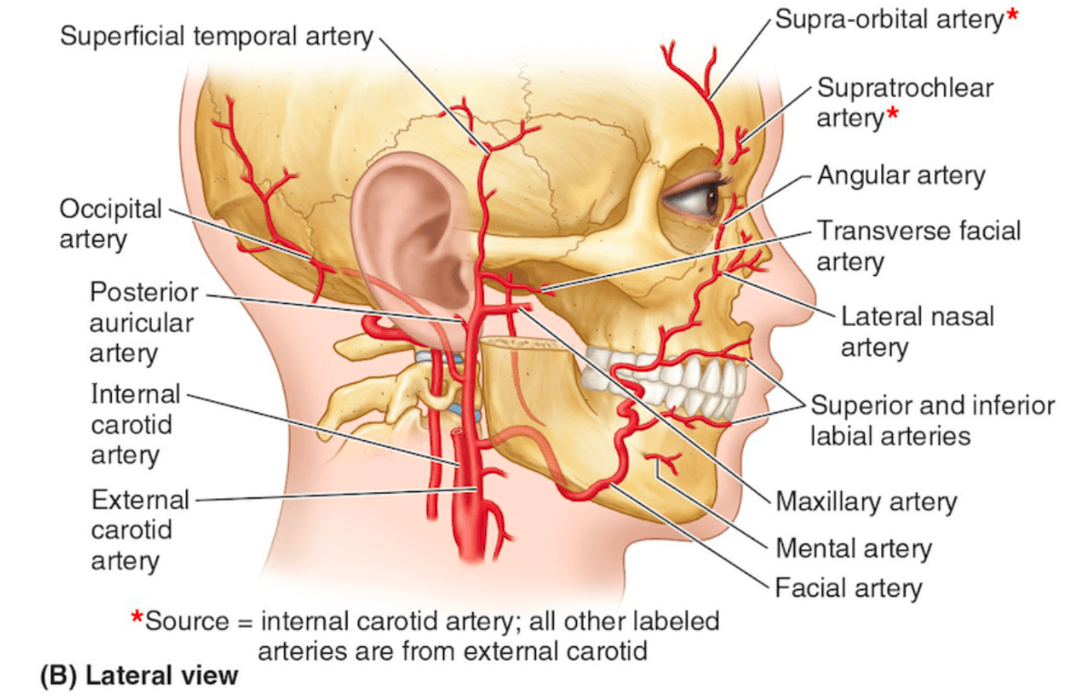 The supraorbital artery arises from the ophthalmic artery, which is a branch of the internal carotid artery. The facial artery arises from the external carotid.