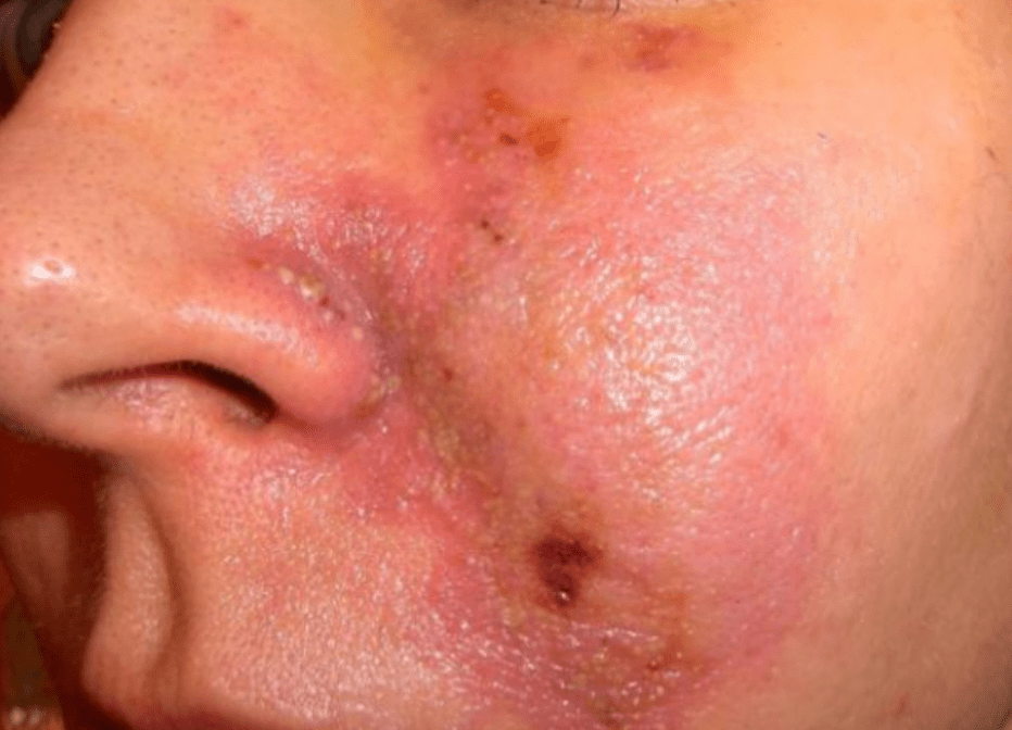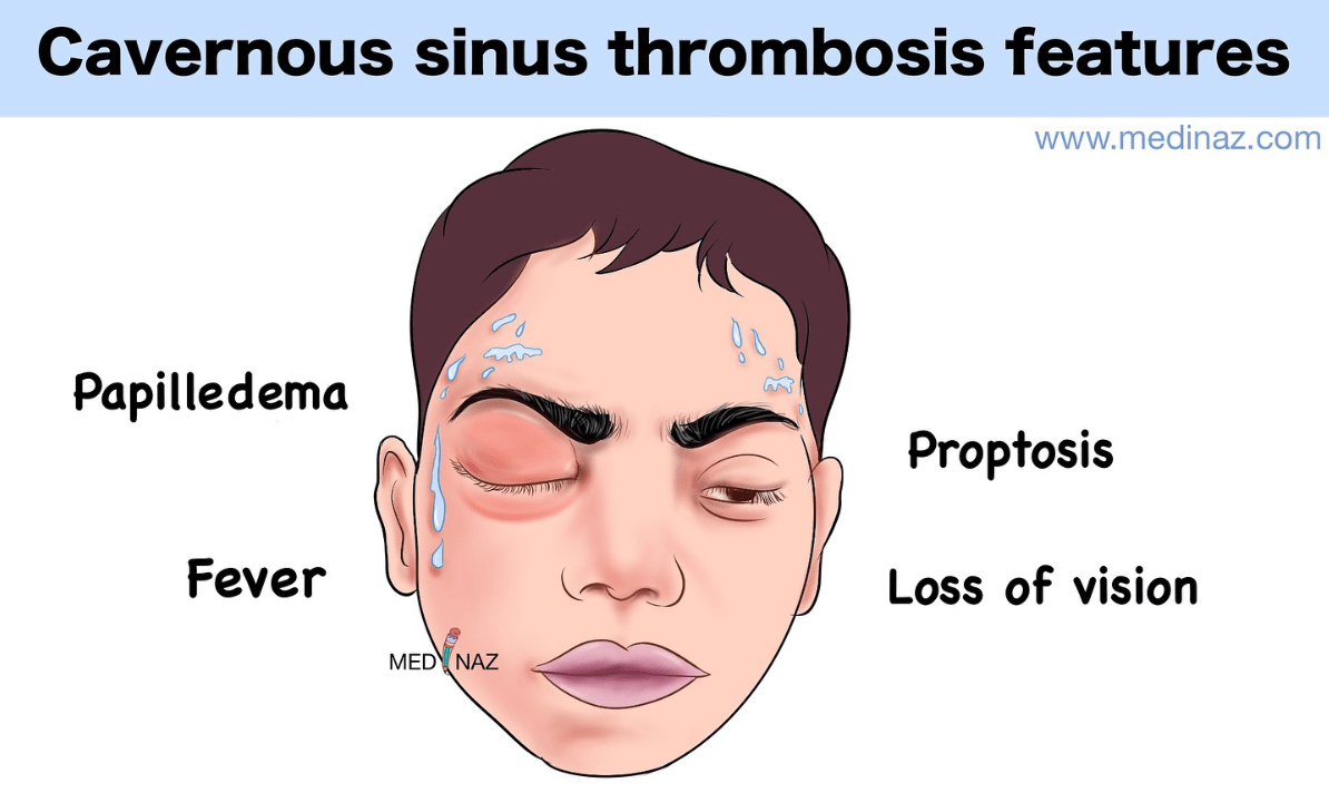A patient develops fever, eye pain, and swelling a few days after squeezing a pimple on the upper lip. A bacterial infection spread through the valveless facial veins into the dural venous sinus system, leading to cavernous sinus thrombosis with papilledema, proptosis, and vision loss from venous congestion.