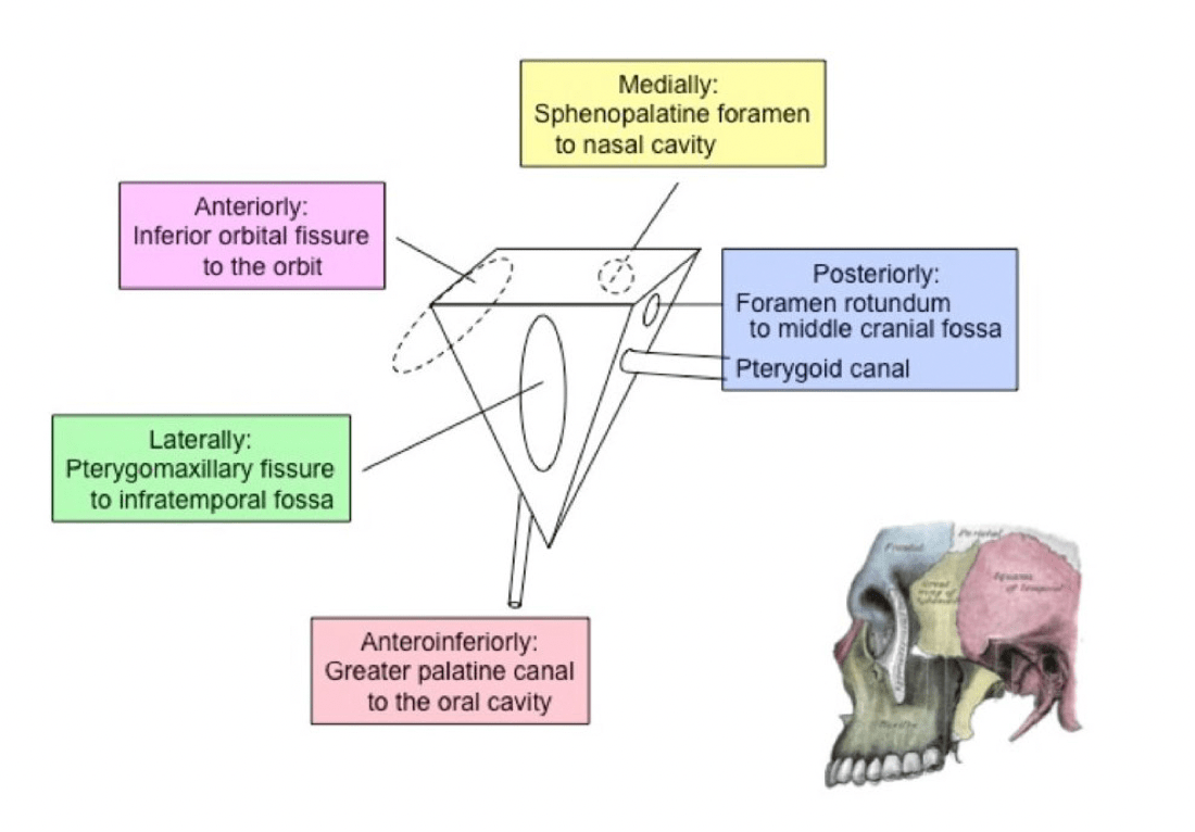 The pterygopalatine fossa serves as a key crossroads between the nasal cavity, orbit, oral cavity, and middle cranial fossa. It houses the pterygopalatine ganglion, which carries parasympathetic fibers responsible for lacrimal gland secretion and nasal mucosal innervation. A major branch of the external carotid artery also courses through this space, giving off several branches before entering the nasal cavity as the sphenopalatine artery. Through which foramen does this artery pass to reach the nasal cavity?