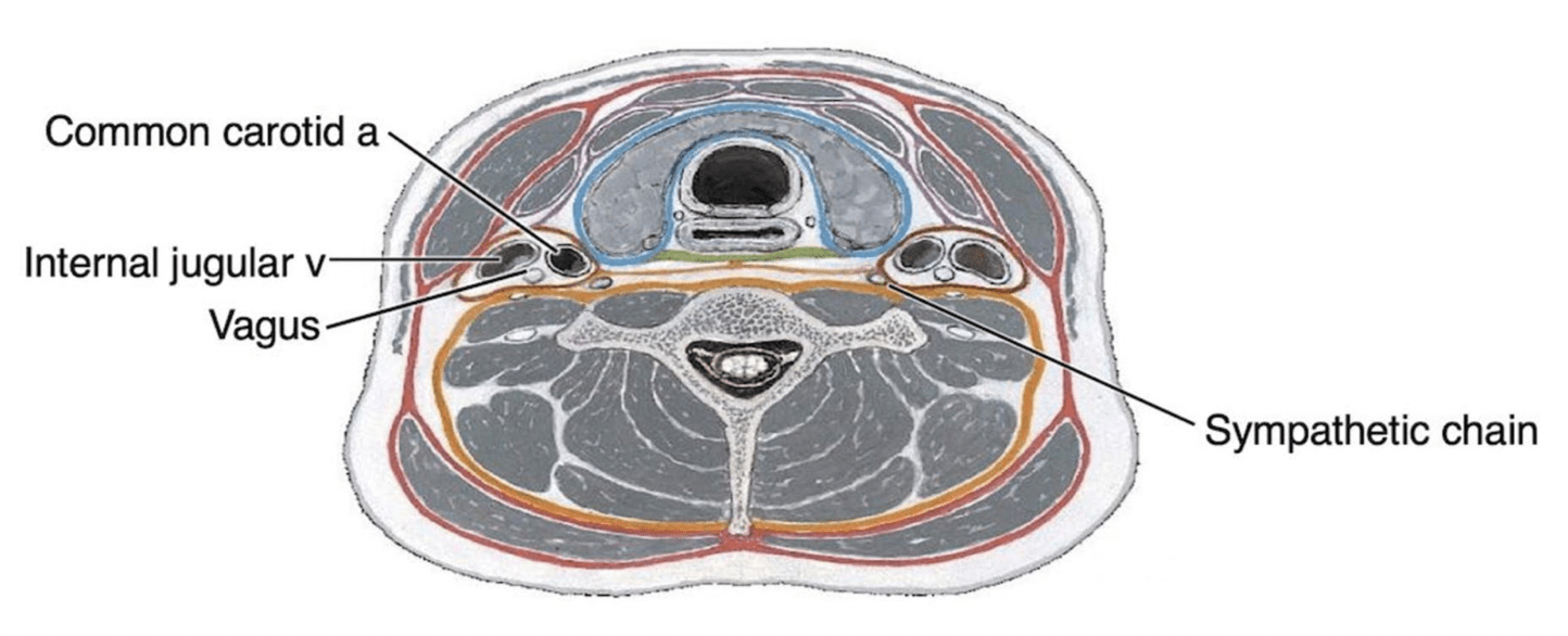 The vagus nerve (CN X), which gives rise to the recurrent laryngeal nerve, lies within the carotid sheath, positioned posteriorly between the internal jugular vein and common carotid artery.