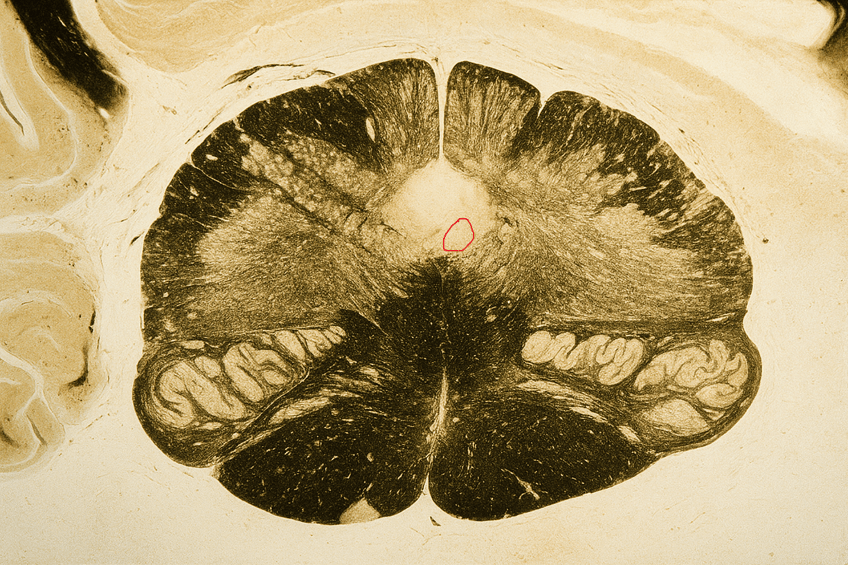 Locked-in syndrome has no cure and can strike without warning. Some patients wake up suddenly, fully conscious but completely paralyzed, unable to move or speak. A basilar artery stroke destroys the ventral pons, interrupting the 3 descending motor tracts, while sparing sensory pathways and consciousness. Because the oculomotor and trochlear nerves arise above the lesion in the midbrain, patients can usually still move their eyes vertically and blink, but no other skeletal muscles respond. Which specific midbrain structure normally contains all 3 of the destroyed tracts as they pass through the midbrain?