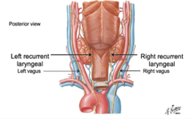 During thyroid or parathyroid surgery, special care must be taken to preserve the recurrent laryngeal nerves, which loop around different structures on each side before ascending to innervate the intrinsic muscles of the larynx (except the cricothyroid). On the right, it loops around the right subclavian artery, and on the left, around the aortic arch.