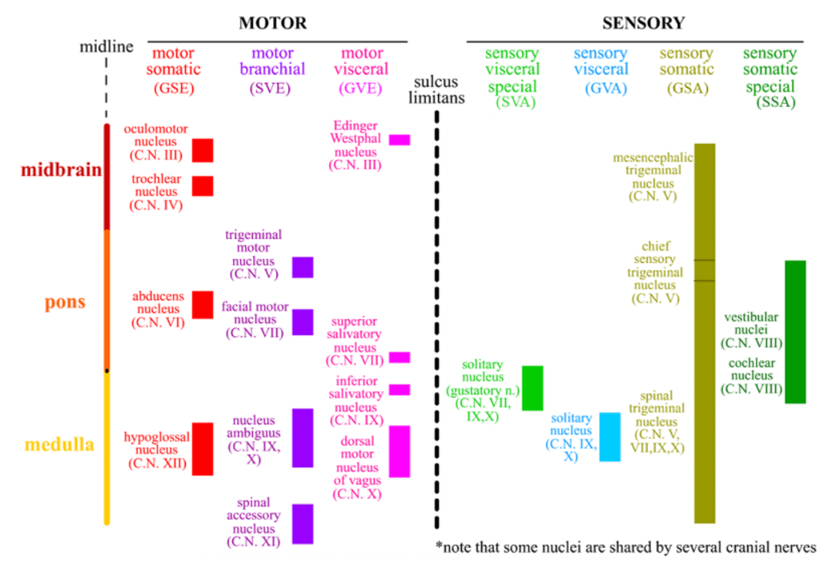 Most cranial nerve nuclei act ipsilaterally, but the trochlear nucleus is unique in that its fibers decussate within the midbrain, producing a contralateral deficit when the nucleus is damaged and an ipsilateral one when the nerve itself is damaged.