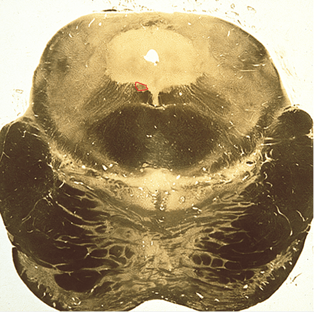 The circled nucleus in this pontine cross section gives rise to a cranial nerve that helps control extraocular movement of the eye.
