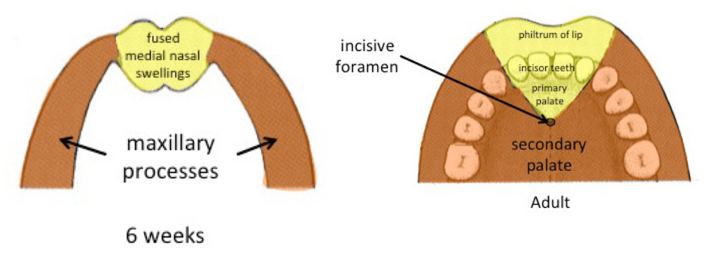 Children with Patau syndrome (trisomy 13) are usually born with a severe, bilateral midline cleft lip and palate, reflecting a failure of midline facial structures to properly fuse during development. This type of cleft results from abnormal formation and fusion of which embryonic structure that normally contributes to the philtrum, upper jaw midline, and primary palate?