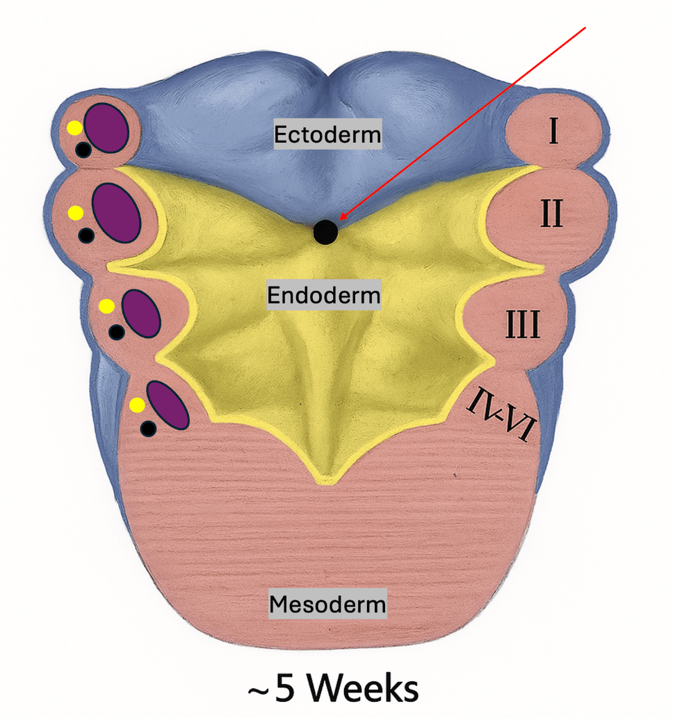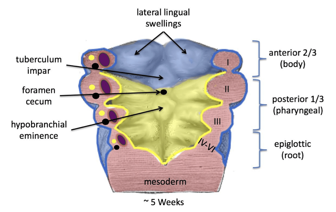 Most tongue muscles arise from mesoderm of occipital myotomes with the exception of the palatoglossus, which originates from mesoderm of the fourth pharyngeal arch and is innervated by the vagus nerve, not the hypoglossal. The palatoglossus is also a muscle of the soft palate.