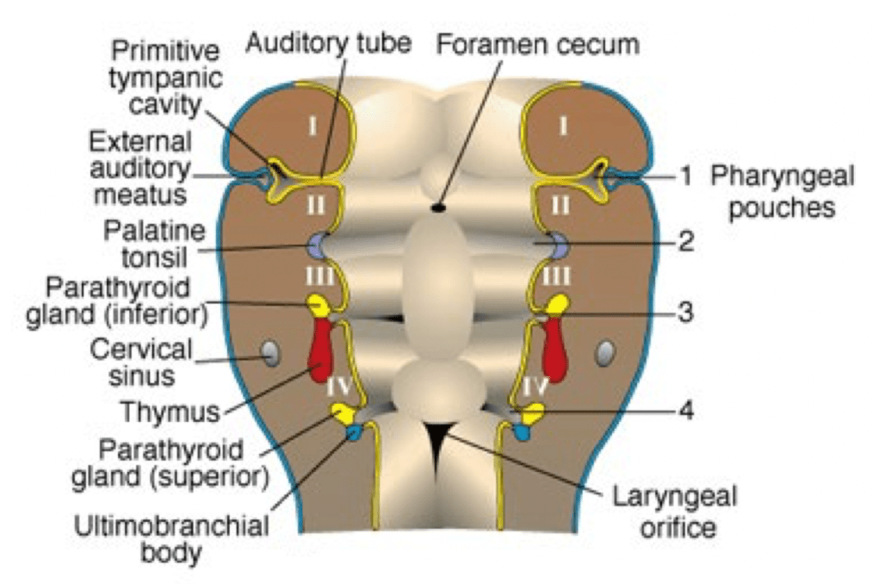 Rubella is a viral infection and one of the few infectious agents capable of crossing the placenta to cause congenital defects, including deafness, cataracts, and cardiac malformations. Hearing loss in these infants may result from abnormal development of structures derived from which pharyngeal pouch, responsible for forming the medial side of the tympanic membrane, epithelial lining of the middle ear cavity, and Eustachian tube?