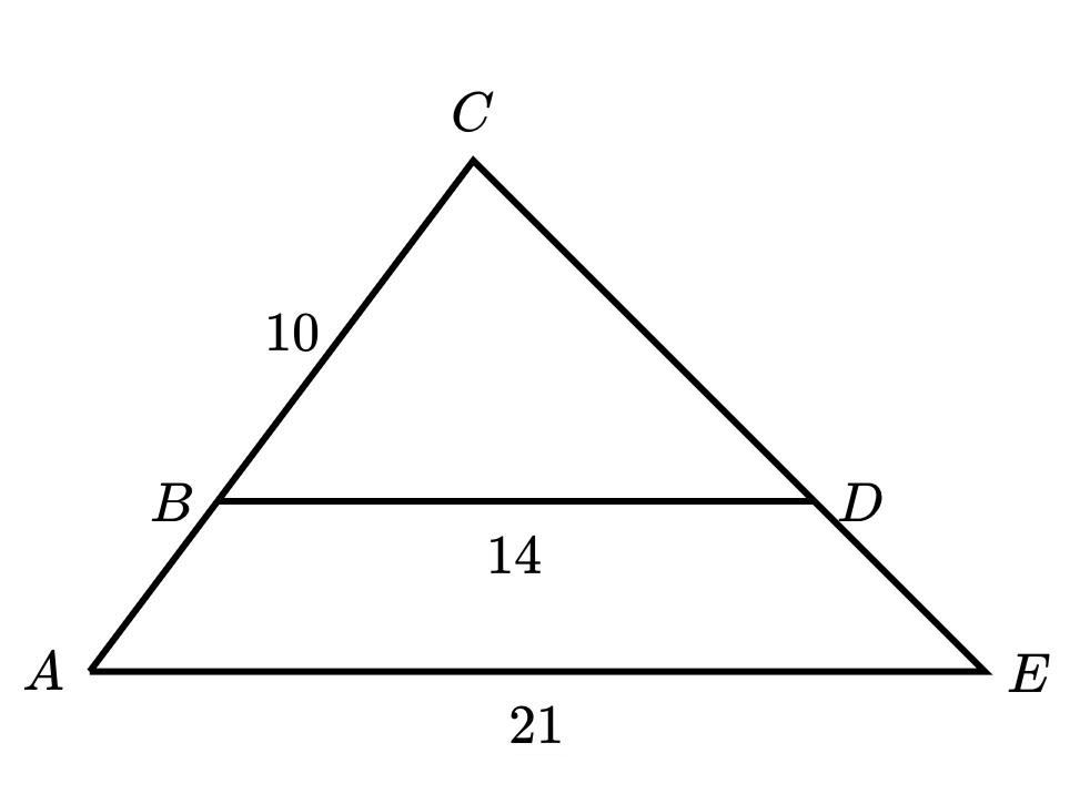 In the figure below, BD is parallel to AE. If BC=10, BD=14, and AE=21, the length of AC is…
