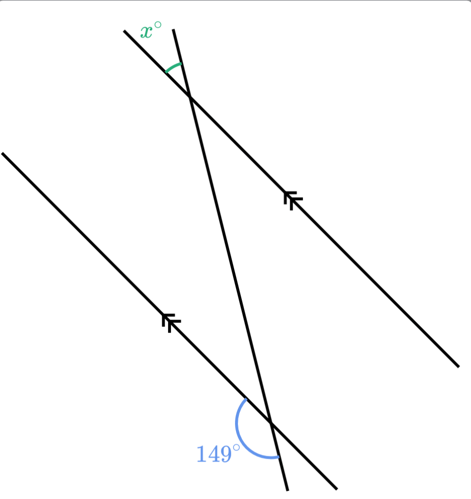 Below are two parallel lines with a third line intersecting them. The value of x.