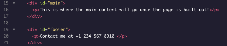 Change Line 15 to <main>, change Line 17 to </main>, change Line 19 to <footer>, change Line 21 to </footer>.