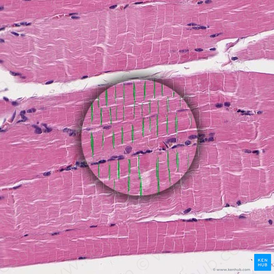 El músculo en su totalidad es rodeado por TCDI (Epimisio-amarillo), rodeando fascículos de fibras musculares encontramos al perimisio (azul) y al último, fibras reticulares y una lámina basal rodean a cada célula muscular (verde).