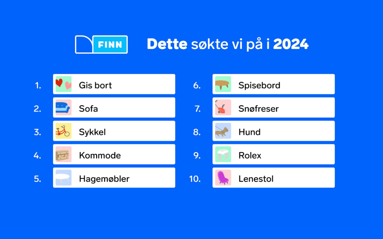 Hva er 3 av de top 10 mest brukte søkeordene og frasene på hele FINN 2024?