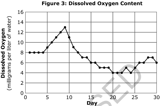 A fish population in Calm Lake is considered unsafe if the dissolved oxygen (DO) content drops below 6 milligrams per liter. Based on data from the figure, on which day did Calm Lake first become unsafe for the fish and remain unsafe for several days?
