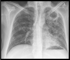 73yo male with no PMH comes to clinic with complaint of fever and SOB/cough. He has intermittent lower right chest pain, and poor appetite for 3 days, but otherwise is okay. Denies N/V/D or abd pain. He is not confused. On exam he is mildly tachycardic, tachypneic, SpO2 is 91%, has no WOB, but does have some RLL consolidation on egophany testing. CXR ordered in clinic.