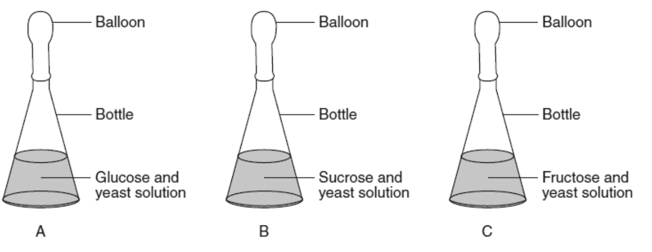 • When yeast and sucrose (or glucose or fructose) are combined in a container with a balloon over it, the balloon will inflate the most.